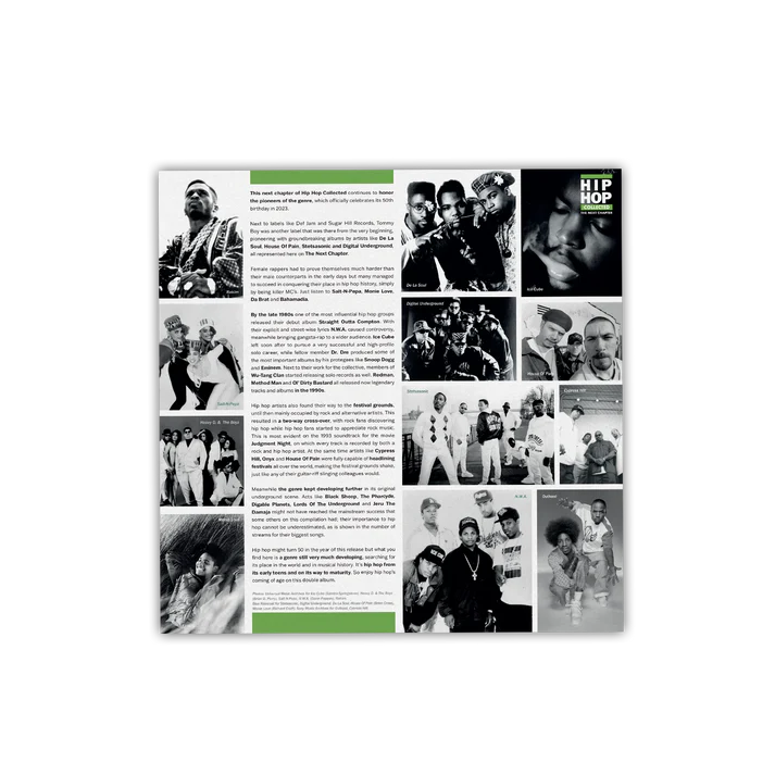 Hip Hop Collected - The Next Chapter nadal honoruje pionierów gatunku, który oficjalnie obchodzi swoje 50. urodziny w 2023 roku. Zawiera przełomowych artystów i więcej pionierów hip-hopu, w tym De La Soul, Cypress Hill, gangsta-rap N.W.A, Dr. Dre ft. Snoop Dogg, party-tracki Digital Underground, Heavy D & The Boyz, raperki i grupy Da Brat, Monie Love, Salt-N-Pepa i wiele innych obejmujących szerokie spektrum hip-hopu. Hip Hop Collected - The Next Chapter zawiera wkładkę z notatkami, zdjęciami i kredytami.